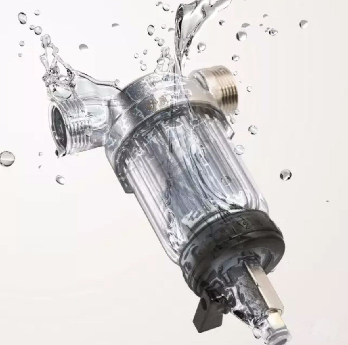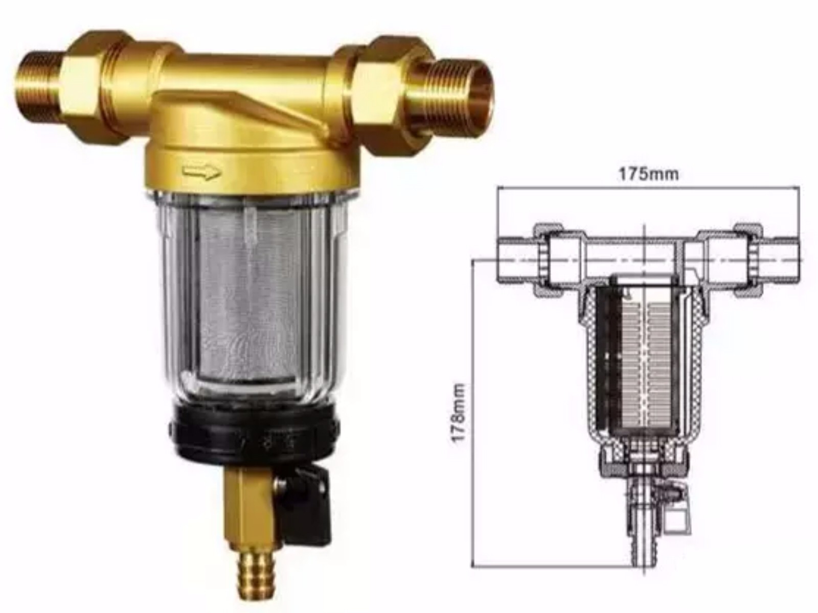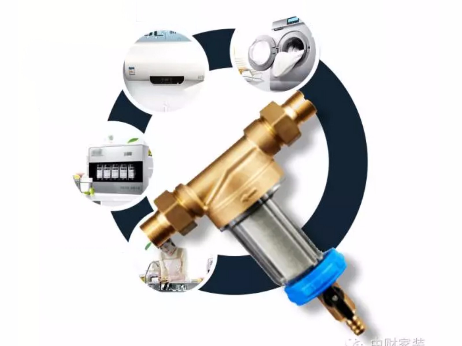 前置过滤器是对全屋用水的第一道粗过滤设备,可以过滤自来水中的泥沙,铁锈,大颗粒物质。前置过滤器一般安装在管道的前端,所以以“前置”二字来命名。而“过滤”,则指的是这类设备的基本原理。过滤器通常为“T”型结构。上面的“一横”位置左右两端分别为进出水口,下面的“一竖”位置为机身和内部的筒形过滤网,最下端则为排污口,靠一个阀门来控制开启和关闭。