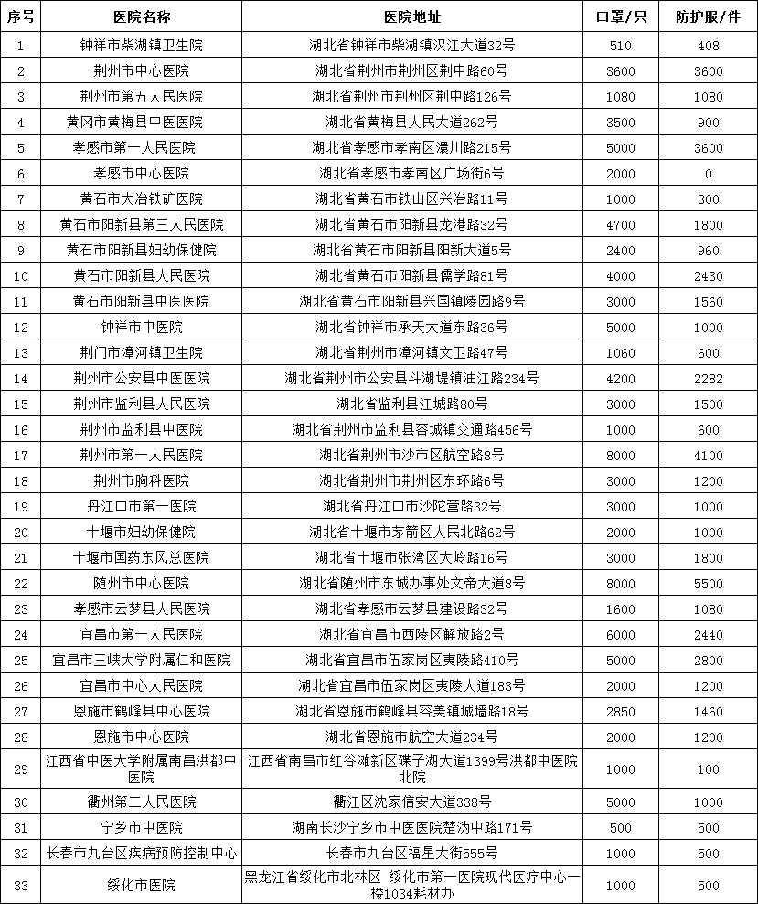 经了解并深入沟通,我们确认了承担医治任务较多但资源配给相对薄弱、医护人员暴露风险较高的湖北28家地县级医院,代表集团全体捐赠人向他们发出了医用防护服和N95口罩。另外,我们也受托定向捐赠5家医院。具体捐赠医院详见附表,合计捐赠33家医院。