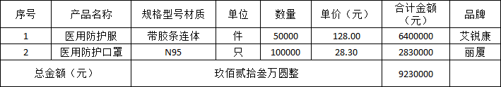 2、捐款用于采购捐赠医用防护服和N95口罩支出9230000元,尚余6459744.50元。具体费用清单: