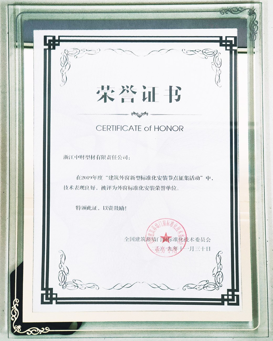 乐鱼网页版登录入口讯 在2019年度“建筑外窗新型标准化安装节点征集活动”中,浙江乐鱼网页版登录入口型材申报的节能型木塑复合标准化门窗附框型材获得肯定并被授予“外窗标准化安装荣誉单位”称号。