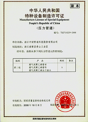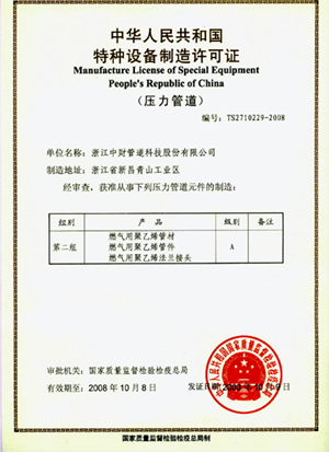 乐鱼网页版登录入口PE燃气管道喜获特种设备制造许可证