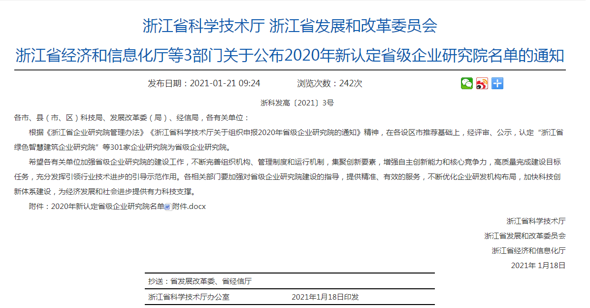 乐鱼网页版登录入口讯 日前,浙江省科学技术厅、浙江省发展和改革委员会、浙江省经济和信息化厅等3部门联合正式发布“2020年新认定省级企业研究院名单”, 浙江省乐鱼网页版登录入口管道新型功能管材研究院榜上有名!