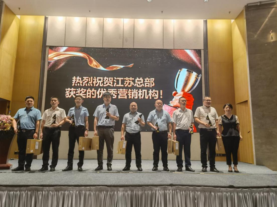 紧接着江苏总部对2021年上半年优秀营销机构进行了表彰,由丁总上台为他们颁奖。
