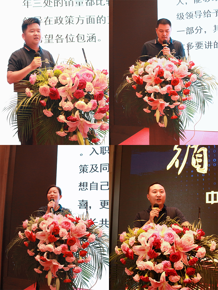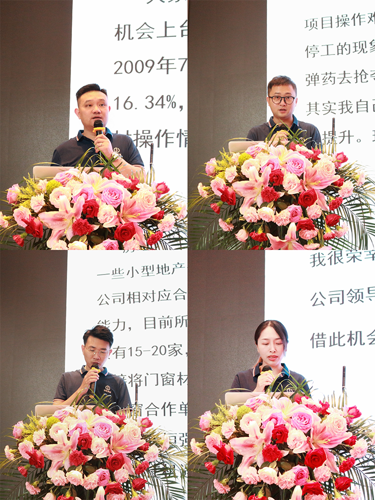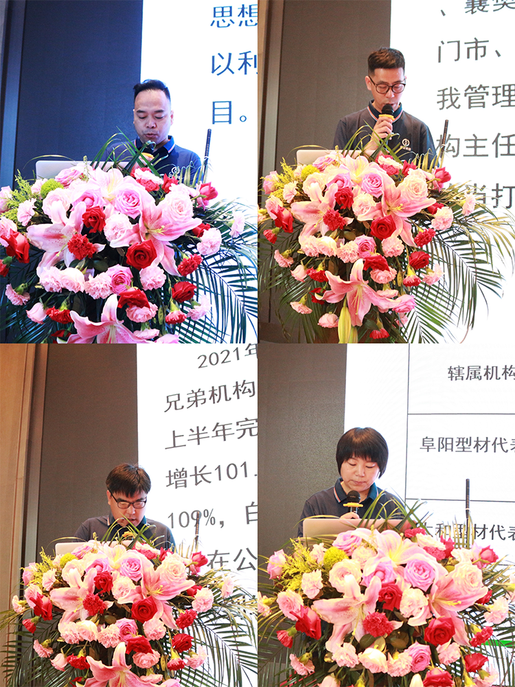 随后皖西型材市场管理处首席执行官贾琪先生、鄂西型材市场管理处首席执行官叶军伟先生、汉阳型材直属销售中心李新先生、阜阳型材直属销售中心刘亚男女士等管理机构优秀代表作了半年度工作报告,分享了上半年销量高速增长及团队培养的心得。