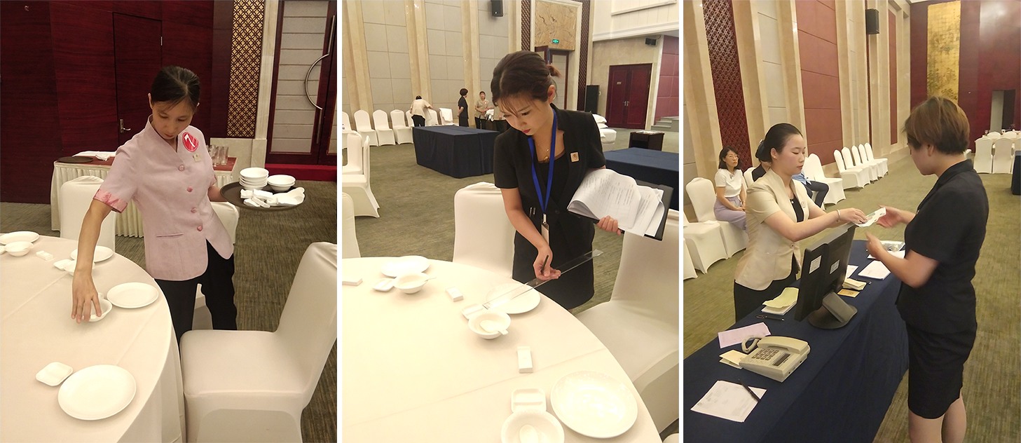 下午1时许比赛正式开始,本次比赛共设中式铺床、中餐宴会摆台、前厅服务、车辆指挥、进房维修、创意菜等六个项目,参赛选手个个精神饱满,英姿飒爽,整个比赛过程秩序井然,现场气氛热烈。大赛过程中参赛选手们娴熟的岗位操作技能、规范的操作程序及标准的仪容仪表给大家留下了深刻的印象。