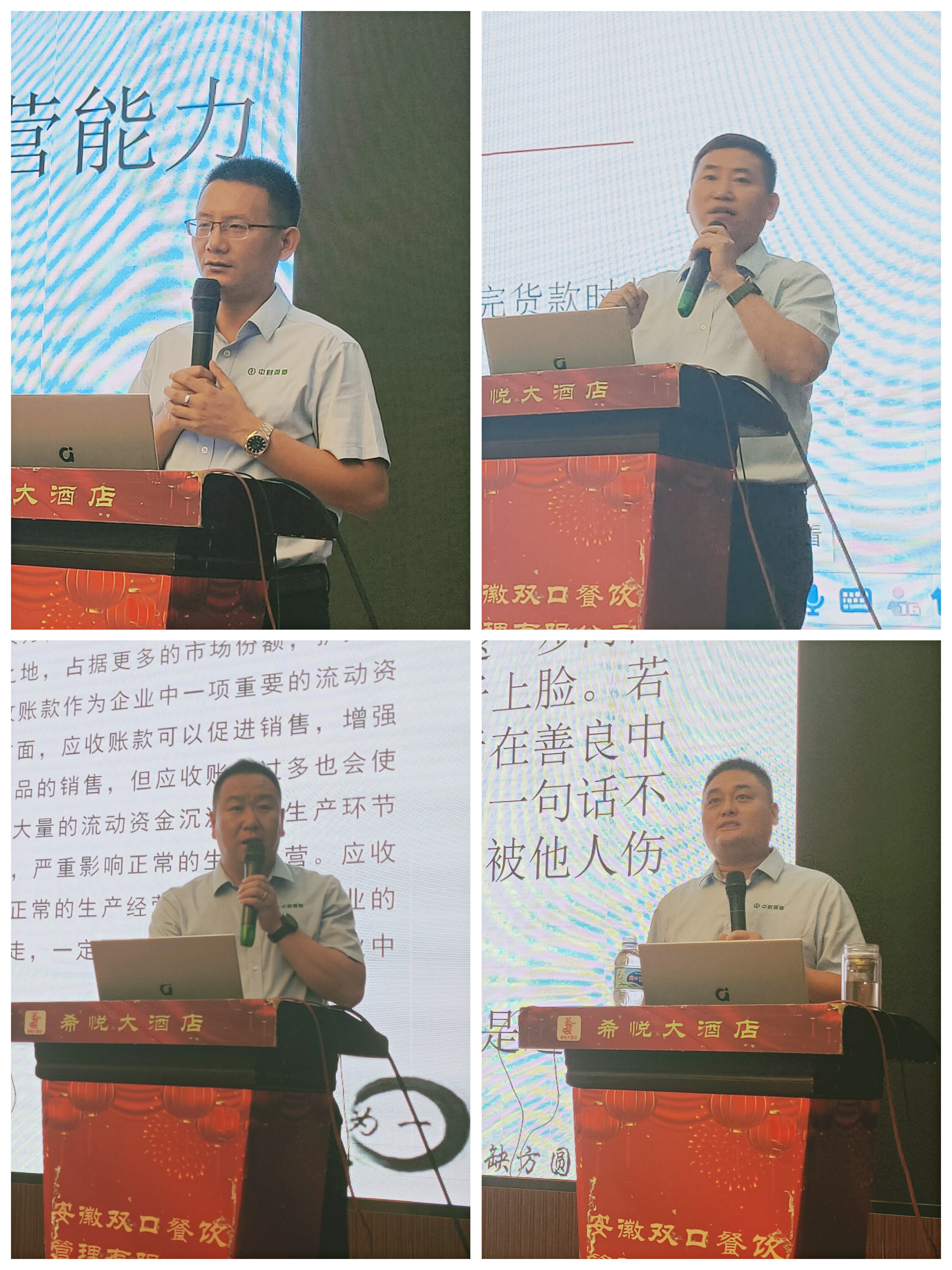 28日上午,江西管道市场管理处首席执行官戴志文,皖西南管道市场管理处首席执行官吕海峰,合肥营销中心总经理陈加明,总部特别助理宋家祥分别对“提高经营能力、促进机构发展“进行经验分享和分析。内容主要涉及合同签订、售货单、对账单、发票、签收回执单、欠条等。特别分享了合同签订的注意事项和风险规避:制定规矩、完善手续、账款管理、降低风险。