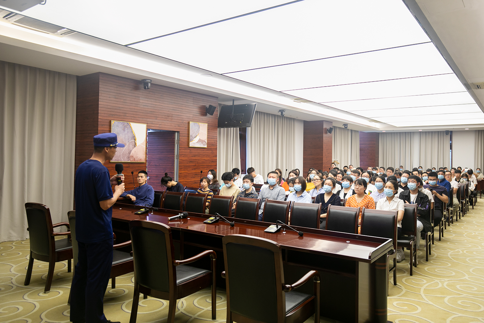 活动开始,参与人员首先在三楼大会议室集合,由高新消防站专业人员讲解消防安全常识,并提示消防演习注意事项。