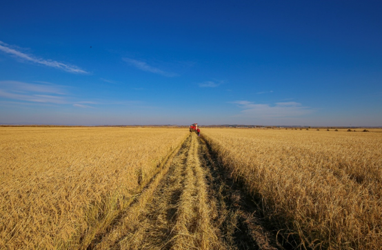 迎着一望无际的稻田,收割机开始收割作业,稻谷堆满了粮仓,又是丰收的一年。