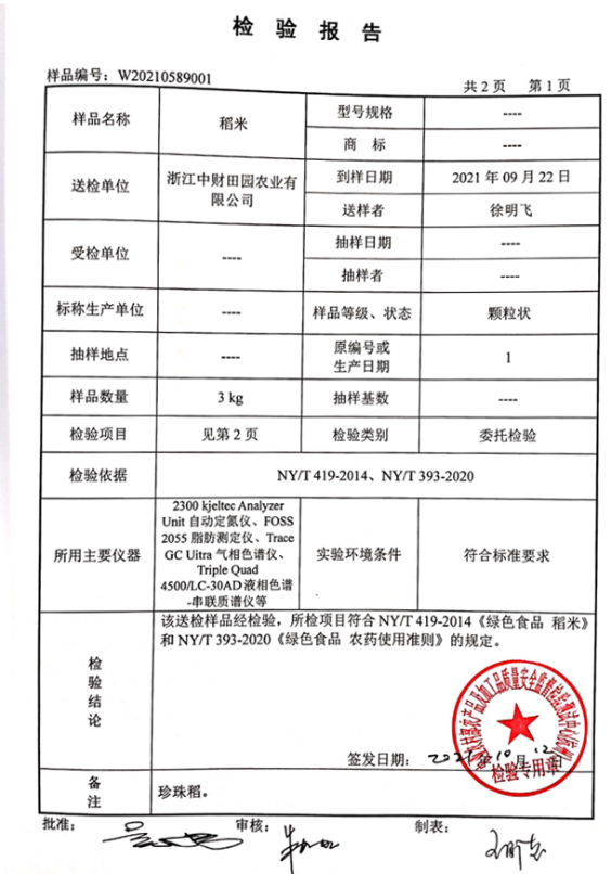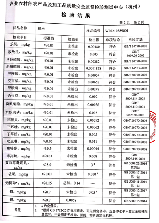 在收获之前,我们在稻田中随机选取水稻样品,送到“农业农村部农产品及加工品质量安全监督检验测试中心(杭州)”并按照NY/T 419-2014《绿色食品 稻米》、NY/T 393-202《绿色食品 农药使用准则》标准进行检测。