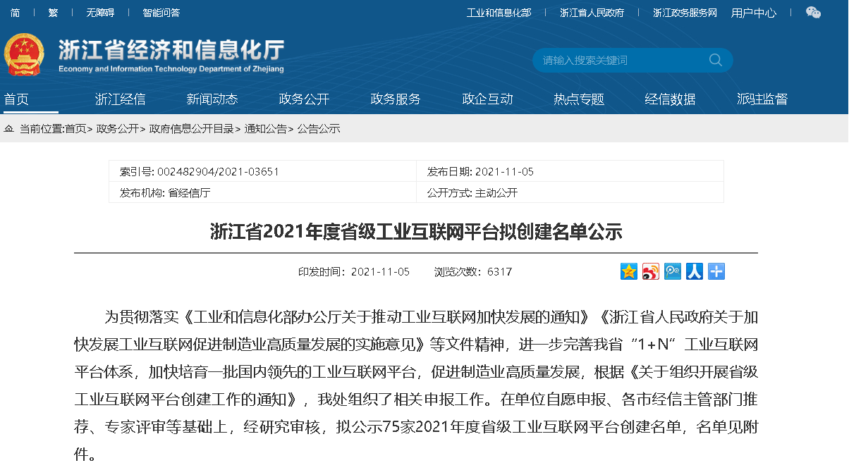 乐鱼网页版登录入口讯 近日,浙江省经济和信息化厅发布了浙江省2021年度省级工业互联网平台创建名单,“MOM智造工业互联网平台”榜上有名,并获得政府奖励120万。这是乐鱼网页版登录入口管道自2019年成功创建“塑料建材信息资源平台建设项目”后又一佳绩。