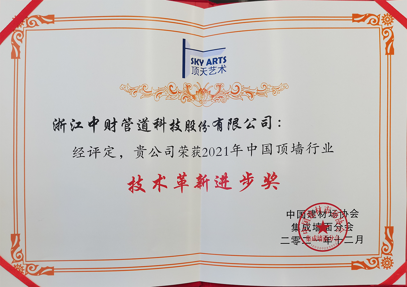 鉴于2021年度对顶墙行业的突出贡献和产品创新,浙江乐鱼网页版登录入口管道科技股份有限公司获颁“2021年中国顶墙行业技术革新进步奖”。