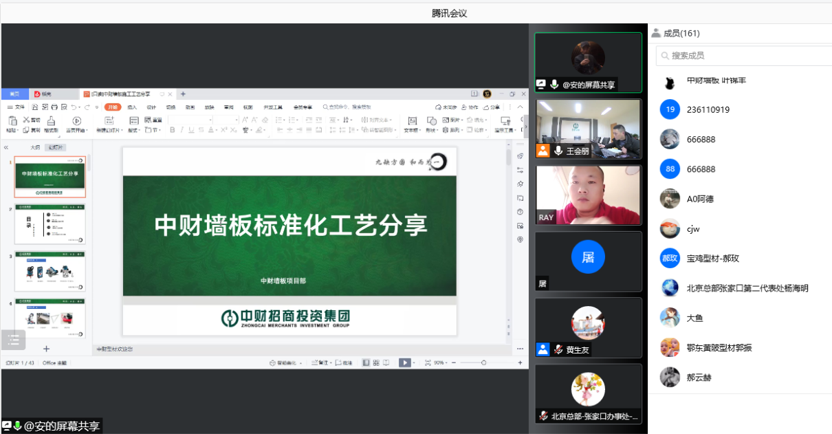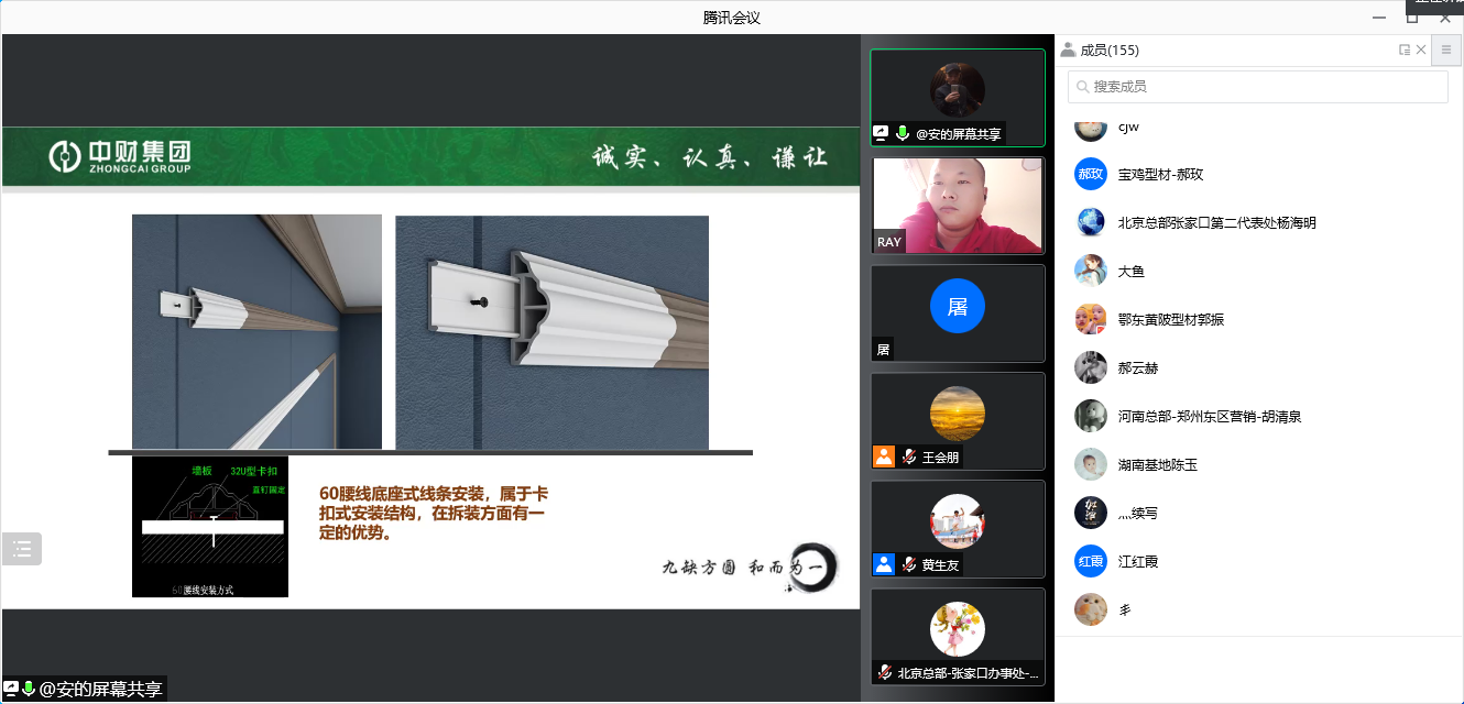 本次培训以腾讯视频会议的形式,各市场总部、化建业相关营销机构、城市零售发展局、基地市场部、各基地墙板设计专员等近170人参与会议。