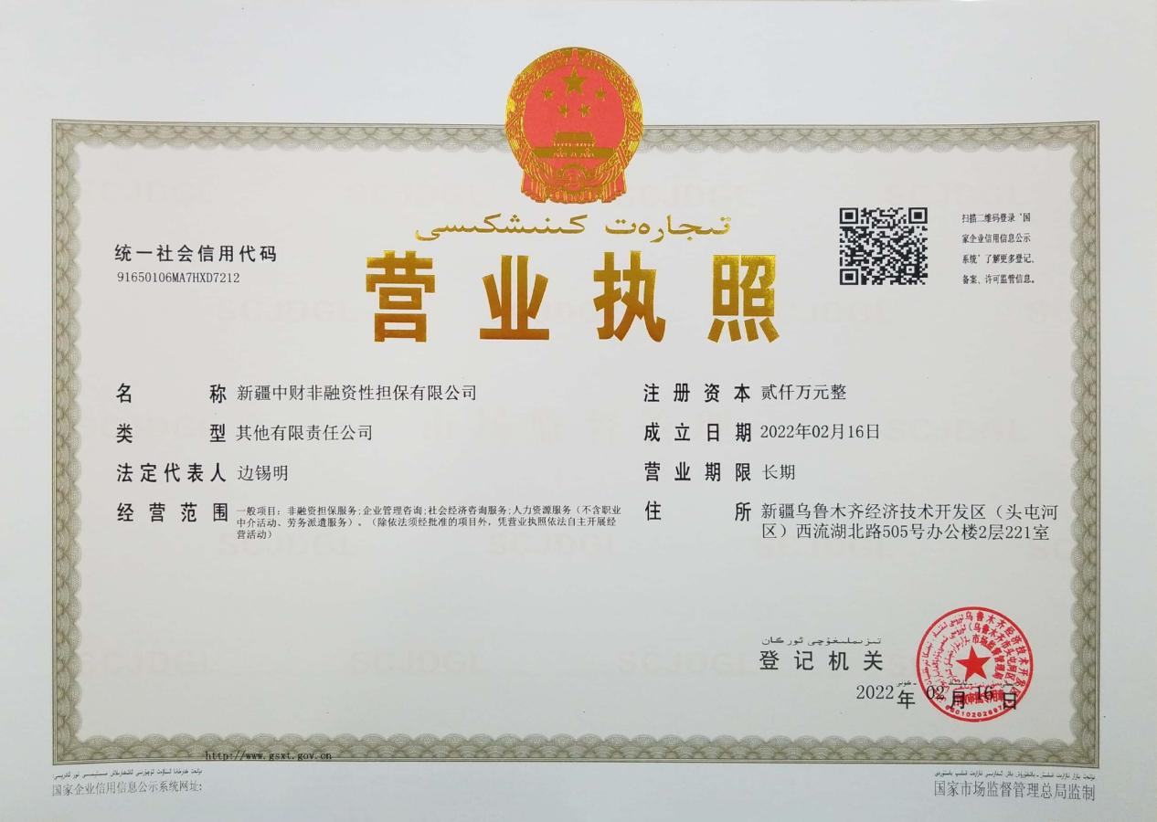 乐鱼网页版登录入口讯 在集团领导及相关部门的配合支持下,2022年2月16日,新疆乐鱼网页版登录入口非融资性担保有限公司完成企业设立登记手续,并成功领取营业执照。