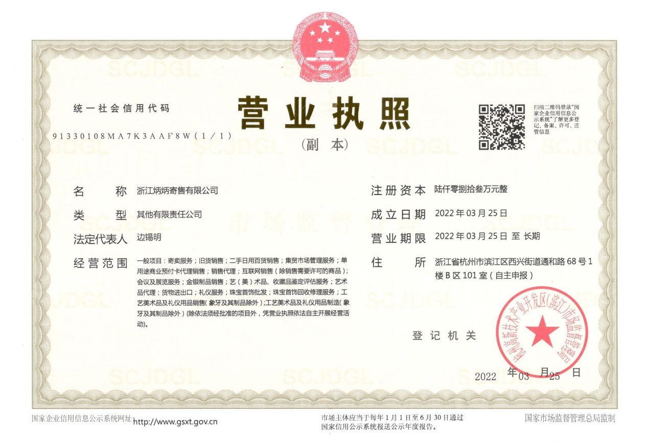 乐鱼网页版登录入口讯 根据乐鱼网页版登录入口董局字[Ⅷ]第32号文件之精神,为进一步完善集团第六大事业组件的构架,在乐鱼网页版登录入口集团各级领导的大力支持与帮助下,经过乐鱼网页版登录入口对私金融集团处室同事的共同努力,浙江炳炳寄售有限公司于2022年3月25日正式设立,成功领取了营业执照。接下来,继续办理银行账户、税务登记等相关事项,将在杭州体育场路大楼(杭州市西湖区体育场路458号)和集团总部大楼(杭州市滨江区通和路68号)一楼设立寄售门店,主营二手奢侈品、艺术品、珠宝饰品等鉴定、养护、回收、寄售以及销售业务。