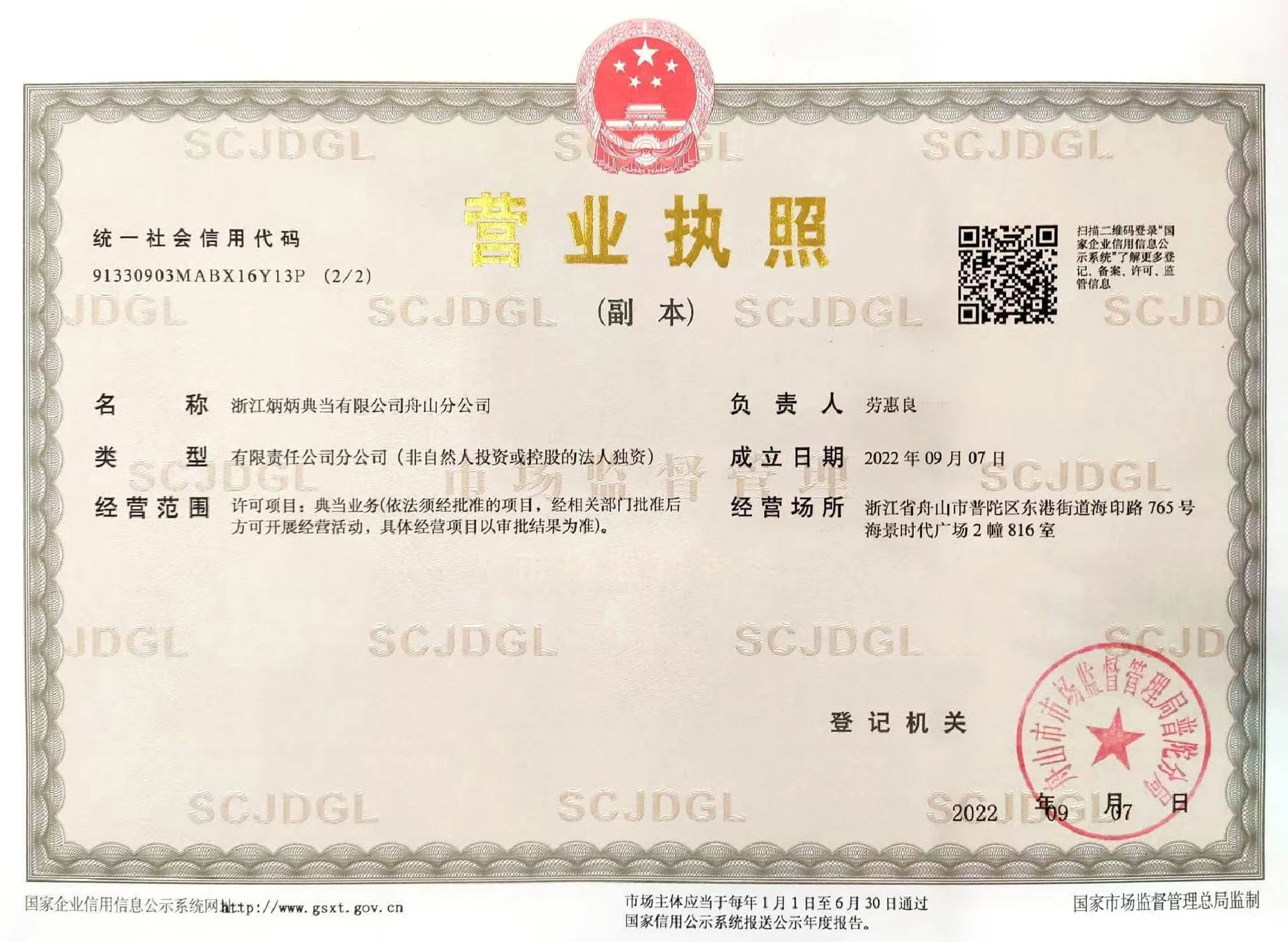 浙江炳炳典当有限公司舟山分公司成功领取营业执照