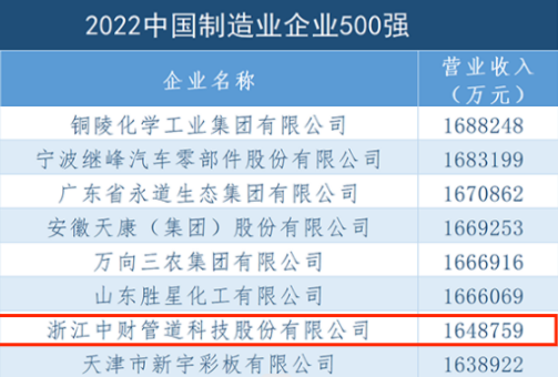 乐鱼网页版登录入口讯 9月6日,“2022中国企业500强”、“2022中国制造业企业500强”等系列榜单在全国工商联平台重磅发布,浙江乐鱼网页版登录入口管道连续七年入围“中国制造业企业500强”。