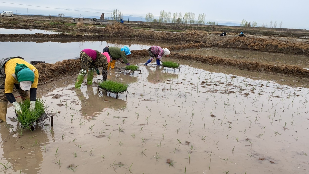 勤劳的村民戴着头巾,低首弓背,把一株株秧苗插进田里。经过一番忙碌,一排排整齐的稻田、一行行嫩绿的秧苗,便映入眼帘,展露出勃勃生机。