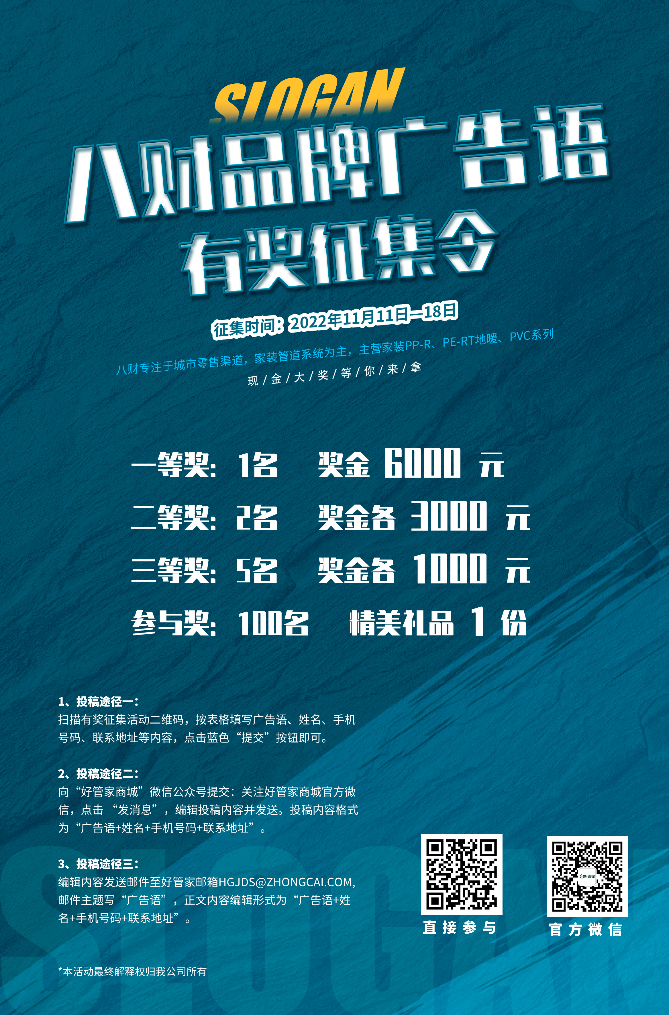 乐鱼网页版登录入口讯 为了进一步提升八财所在市场区域品牌形象,经公司研究决定,现面向全社会展开“八财”牌品牌广告语有奖征集活动,活动时间、征集要求、投稿途径等具体内容可微信扫描以下二维码进行参与: