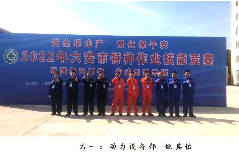强国复兴有我,劳动创造幸福。适逢公司开展质量技能竞赛之际,2022年六安市特种作业技能竞赛在六安市技师学院拉开了帷幕,动力设备部姚其佑荣膺“低压组”三等奖,也是六安市经济技术开发区所有参赛企业电工作业人员中唯一获得奖项人员。