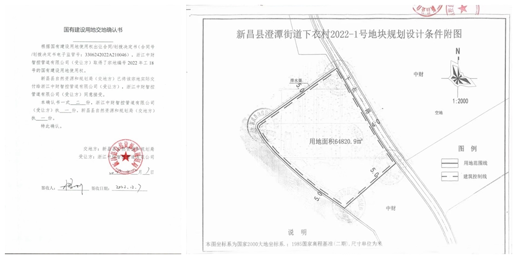 乐鱼网页版登录入口讯 2022年12月5日,在集团董事局的关心及新昌公司的大力支持下,浙江乐鱼网页版登录入口智控管道有限公司与新昌县自然资源和规划局签订了《国有建设用地使用权出让合同》。12月7日,签约双方完成《国有建设用地交地确认书》。