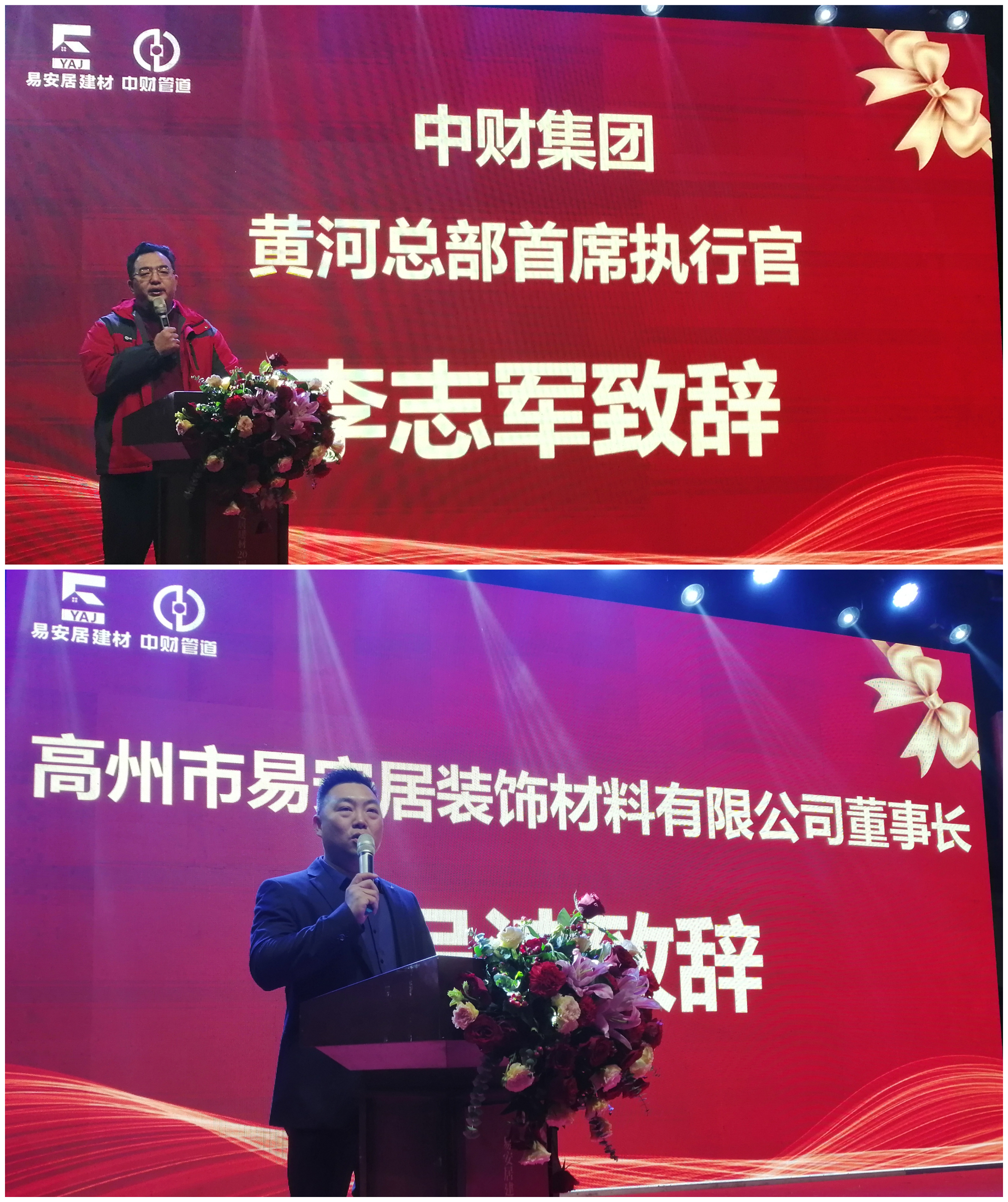 晚宴期间进行了乐鱼网页版登录入口管道产品推介会,活动伊始,黄河总部首席执行官李志军先生与高州市易安居装饰材料有限公司董事长吴波先生,进行了合作签约仪式,并分别致辞,表达了携手同行、共赢未来的美好愿景。