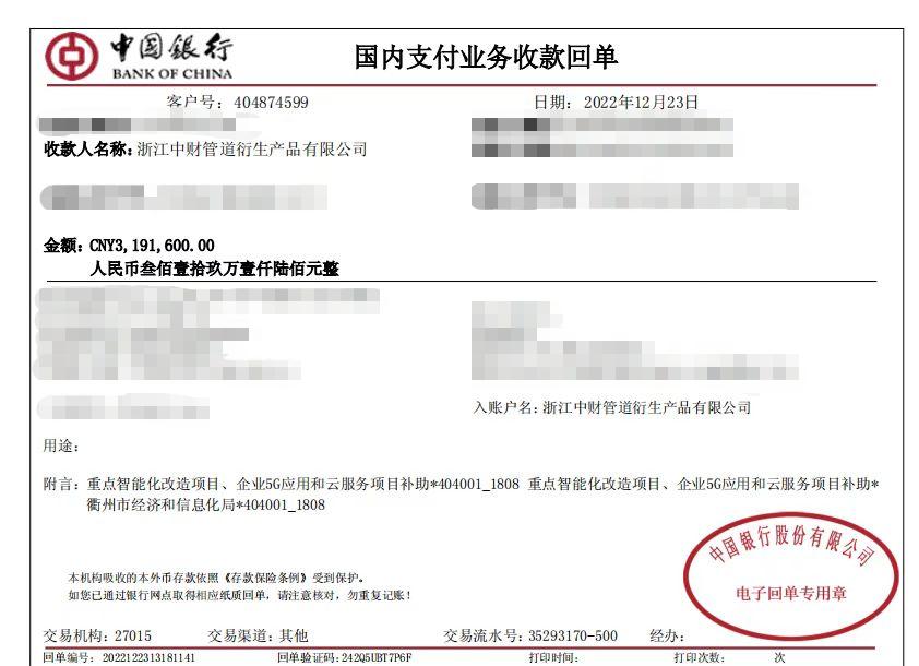 乐鱼网页版登录入口讯 12月23日,浙江乐鱼网页版登录入口管道衍生产品有限公司获得衢州市“重点智能化改造项目、企业5G应用和云服务项目补助”奖励,共计奖励资金319.16万元。