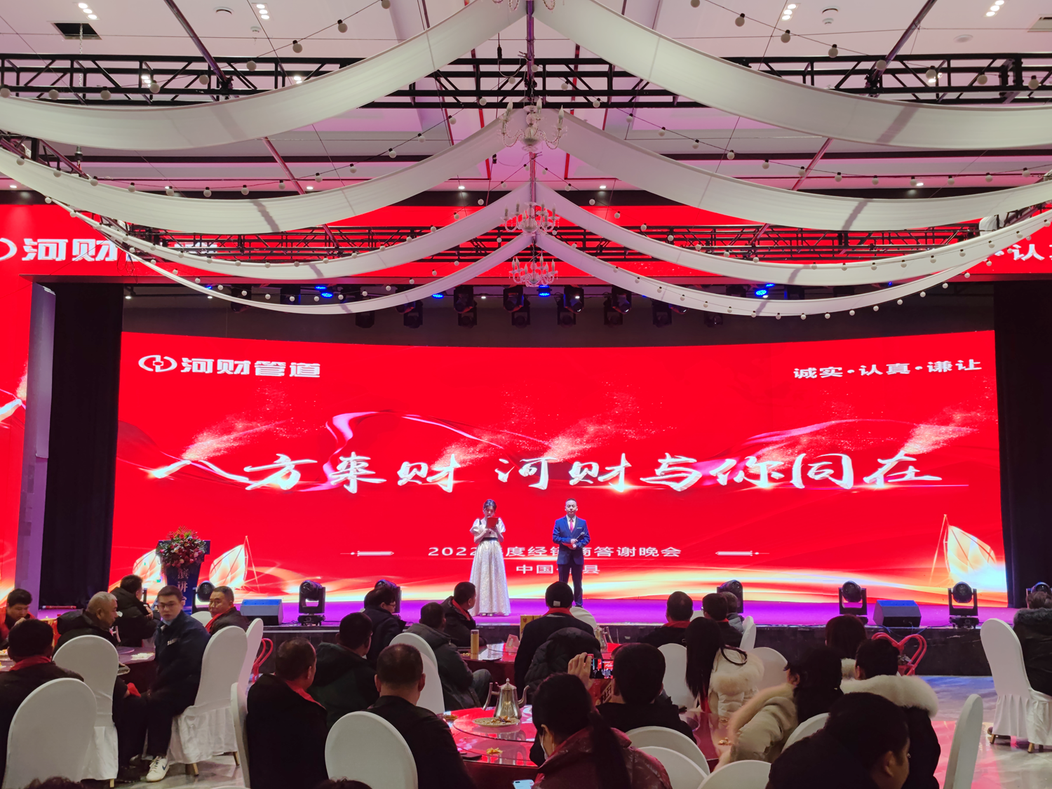 1月14日18时经销商答谢会正式开始,答谢会由公司营销及内务代表金宝印、杨金凤一同主持。晚会首先欣赏了公司宣传视频,在宏大的舞蹈节目“盛世龙腾”之后,执行总裁(八财)俞仲达作了晚会致辞,俞总从河财管道所具的乐鱼网页版登录入口集团背景优势、区位优势、质量优势、服务优势、机制优势等方面向与会嘉宾做了全面系统介绍,河财管道正以“天时、地利、人和”之优势,朝气蓬勃的姿态实现快速的发展,事实将会而且也必会证明广大经销商朋友选择与河财共同发展是正确的、有长远眼光的抉择。河财管道将继续坚持与经销商朋友一道,做大做强,实现共同发展。