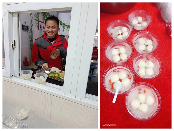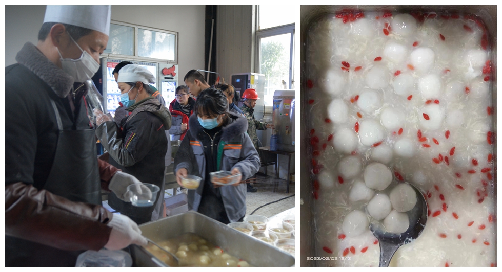 2月3日中餐、夜宵凡食堂、车间打餐员工,公司均免费赠送元宵一份,并于中餐推出特价菜“香辣鸡腿”。