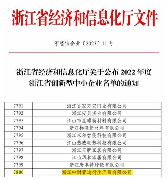 乐鱼网页版登录入口讯 新年伊始,浙江乐鱼网页版登录入口管道衍生产品有限公司喜获浙江省创新型中小企业及专精特新中小企业认定。文号为:浙经信企业〔2023〕11号、浙经信企业〔2023〕23号。