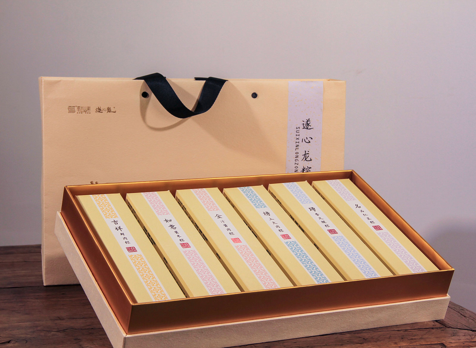 传承中国传统节日复兴,主打“大过中国节”的概念;并本着环保的理念,将纸浆压制成龙舟的形状,用来承托长粽;黑金外盒做了镂空工艺,开盒取粽的同时可以在镂空中看见划龙舟的场景画面。【手提包装上定制乐鱼网页版登录入口logo】