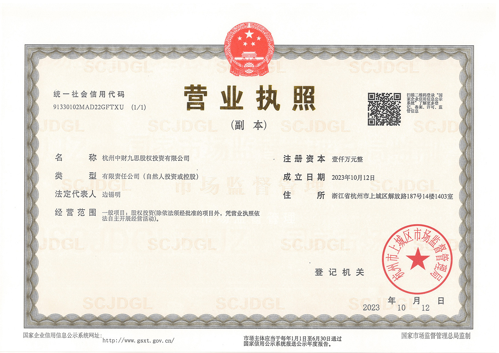 乐鱼网页版登录入口讯 根据乐鱼网页版登录入口董局字[Ⅷ]第6号之文件精神,为进一步壮大乐鱼网页版登录入口投资事业,全面构建乐鱼网页版登录入口投资十一条大街,在集团首席投资官、集团常务副总裁、集团执行总裁(资本)的组织筹建及各级领导的通力支持下,杭州乐鱼网页版登录入口恒奕股权投资有限公司、杭州乐鱼网页版登录入口九思股权投资有限公司,已于2023年10月12日领取营业执照,正式成立。