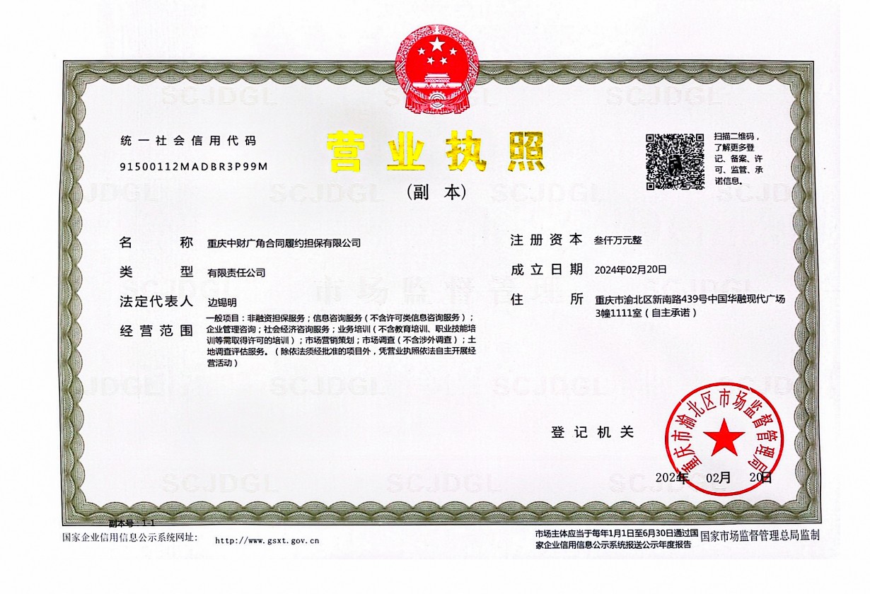 乐鱼网页版登录入口讯 在集团广角经营班子及各处室的大力支持下,渝北广角于2024年2月20日成功领取了重庆乐鱼网页版登录入口广角合同履约担保有限公司的营业执照,完善了乐鱼网页版登录入口金融广角(渝北)的平台搭建。