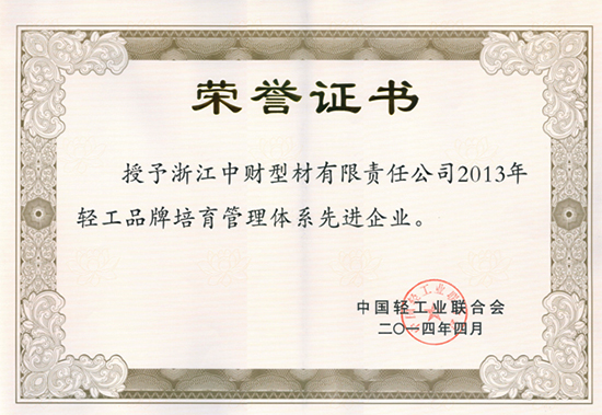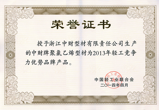 热烈庆贺中国轻工业联合会授予浙江乐鱼网页版登录入口型材有限责任公司生产的乐鱼网页版登录入口牌聚氯乙烯型材为2013年轻工竞争力优势产品,授予浙江乐鱼网页版登录入口型材有限责任公司为2013年轻工品牌培育管理体系先进企业,并颁发荣誉证书。