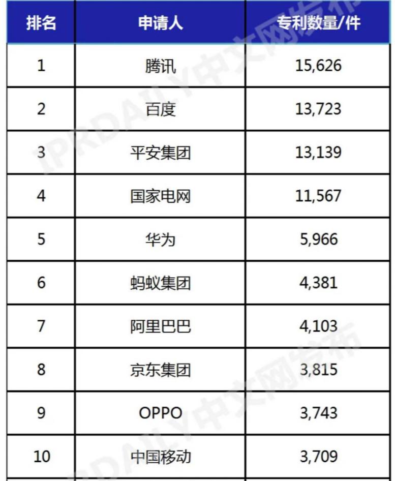 数据显示,上榜企业主要为互联网厂商、金融机构以及通信手机企业,其中腾讯以15626件专利数排名第一,百度、平安集团紧随其后。华为、OPPO则进入前十。
