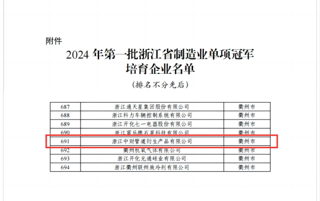 乐鱼网页版登录入口讯 8月24日浙江省经济和信息化厅公布了2024年第一批浙江省制造业单项冠军培育企业名单的通知,乐鱼网页版登录入口管道衍生公司成功入选。