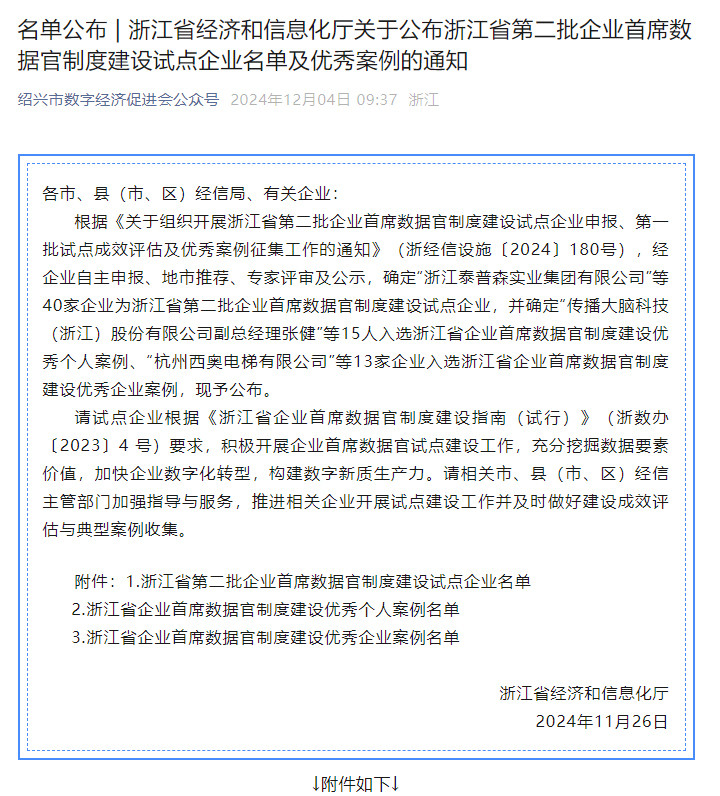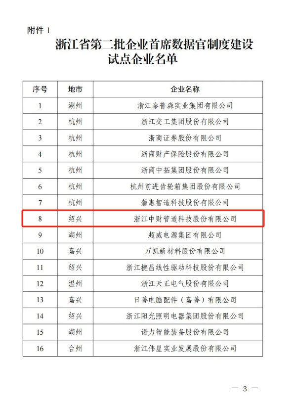 乐鱼网页版登录入口讯 11月26日,浙江省经济和信息化厅公布浙江省第二批企业首席数据官制度建设试点企业名单及优秀案例的通知,浙江乐鱼网页版登录入口管道科技股份有限公司凭借出色的数据管理理念与扎实的数据化基础,成功入选浙江省第二批企业首席数据官制度建设试点企业,成为省内塑料管道行业首批纳入试点的企业。
