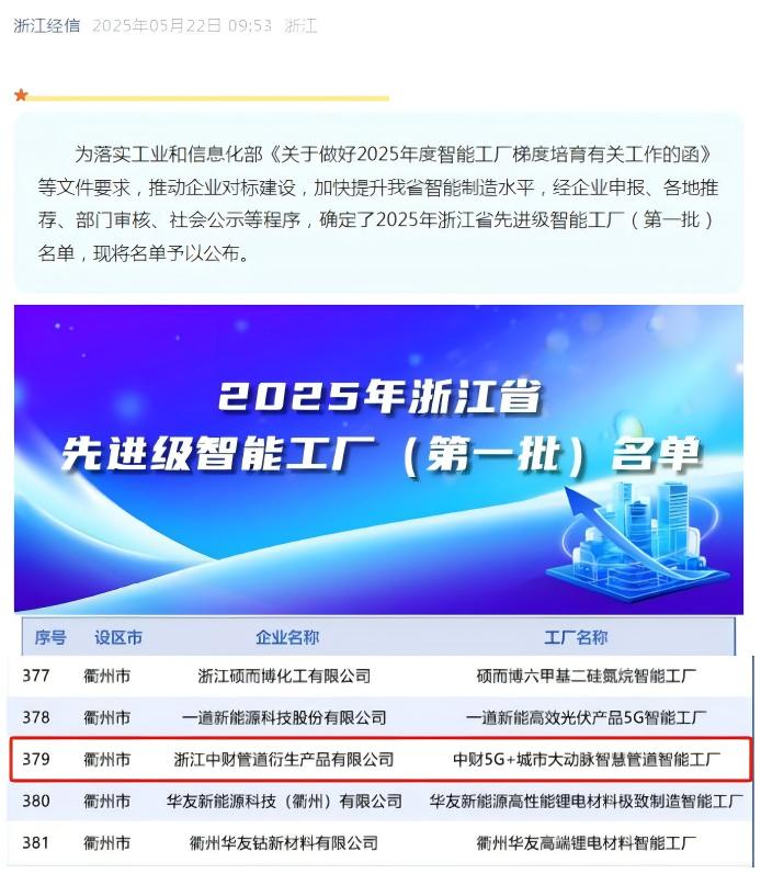 乐鱼网页版登录入口讯 5月22日,浙江省经济和信息化厅正式发布《2025年度浙江省先进级智能工厂(第一批)名单》,乐鱼网页版登录入口管道衍生成功入选。