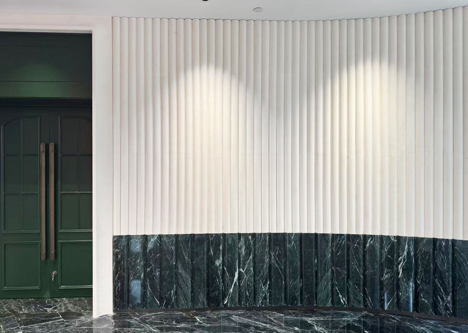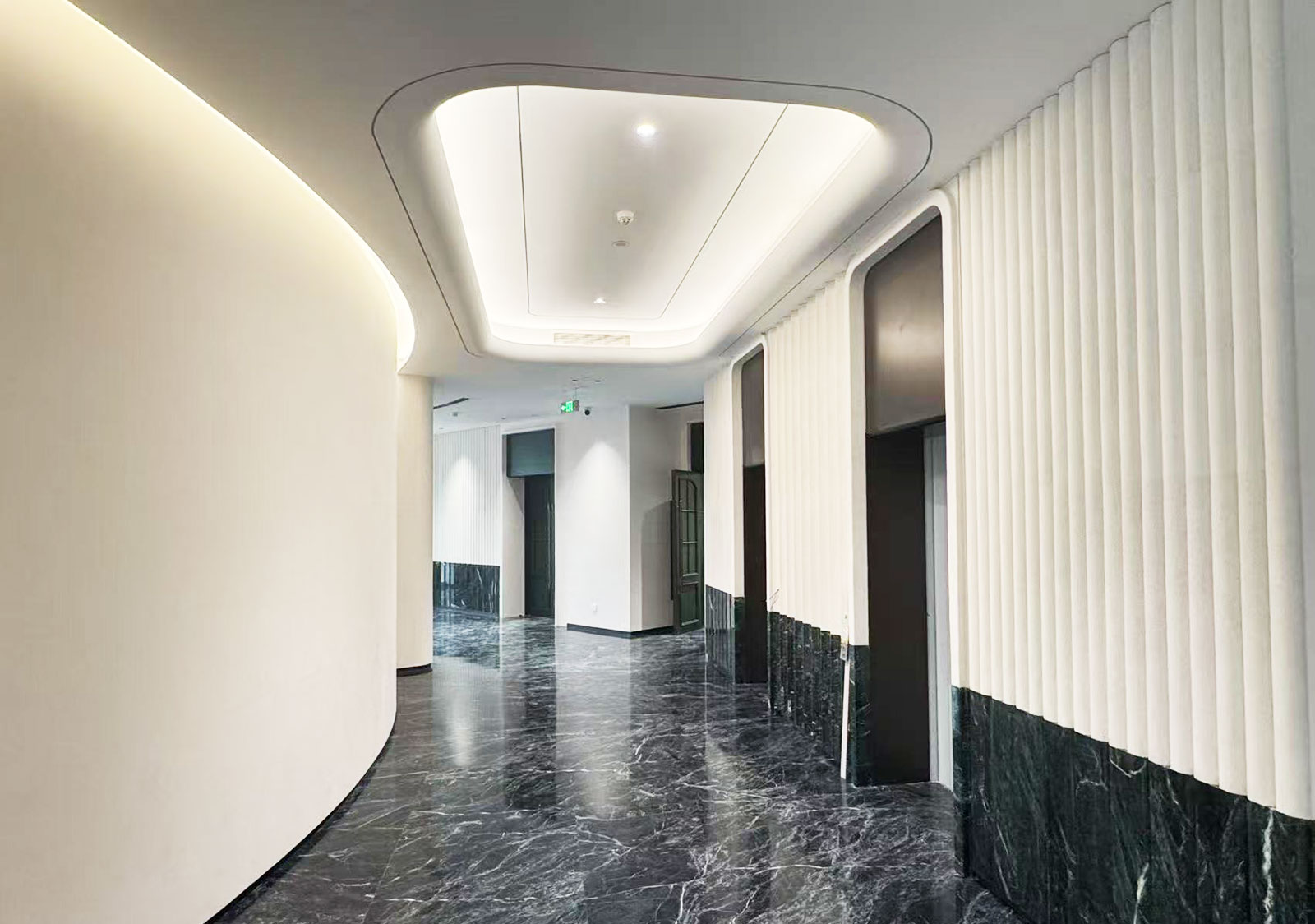 该项目主视觉墙采用普拉达绿石材加白沙米黄石材做造型搭配,打造低调奢华的商务格调;搭配环保乐鱼网页版登录入口墙板,兼顾美学与实用性。