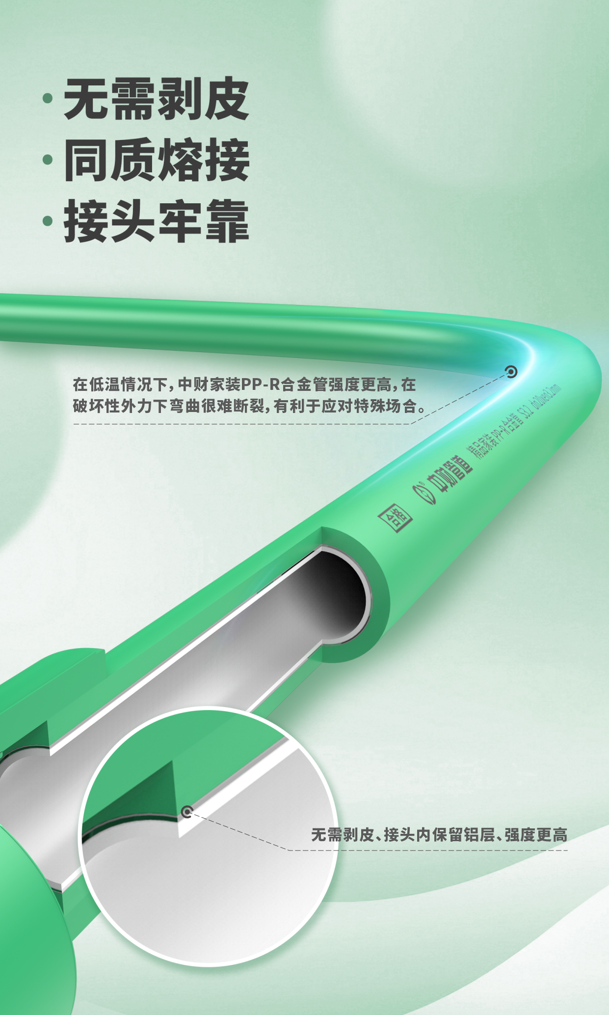 乐鱼网页版登录入口家装PP-R合金管同质热熔连接,无需剥皮,接头内保留铝层,强度更高。在低温情况下,乐鱼网页版登录入口家装PP-R合金管强度更高,在破坏性外力下弯曲很难断裂,有利于应对特殊场合。