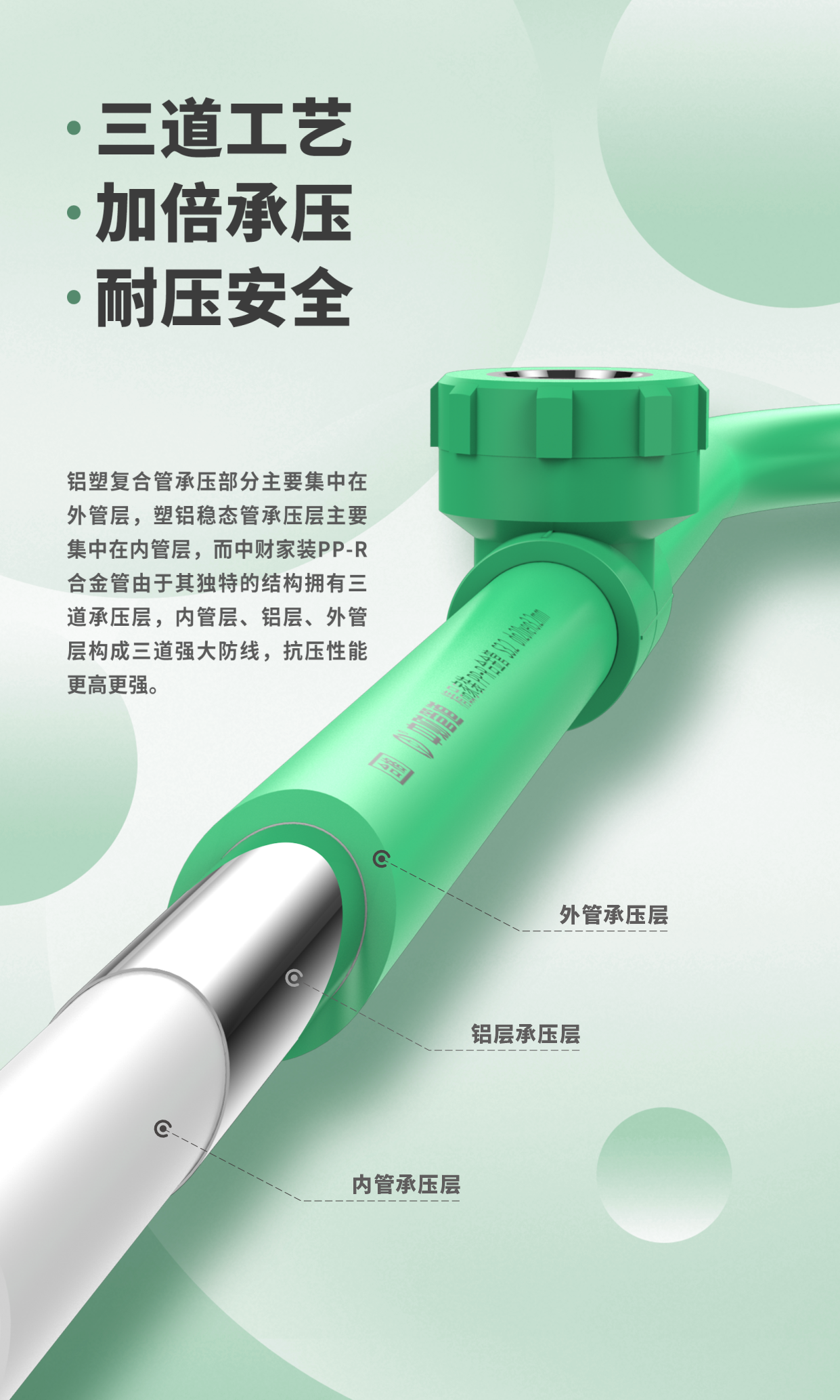 乐鱼网页版登录入口家装PP-R合金管五层结构设计,拥有三道承压层,内管层、铝层、外管层构成三道强大防线,抗压性能更高更强。