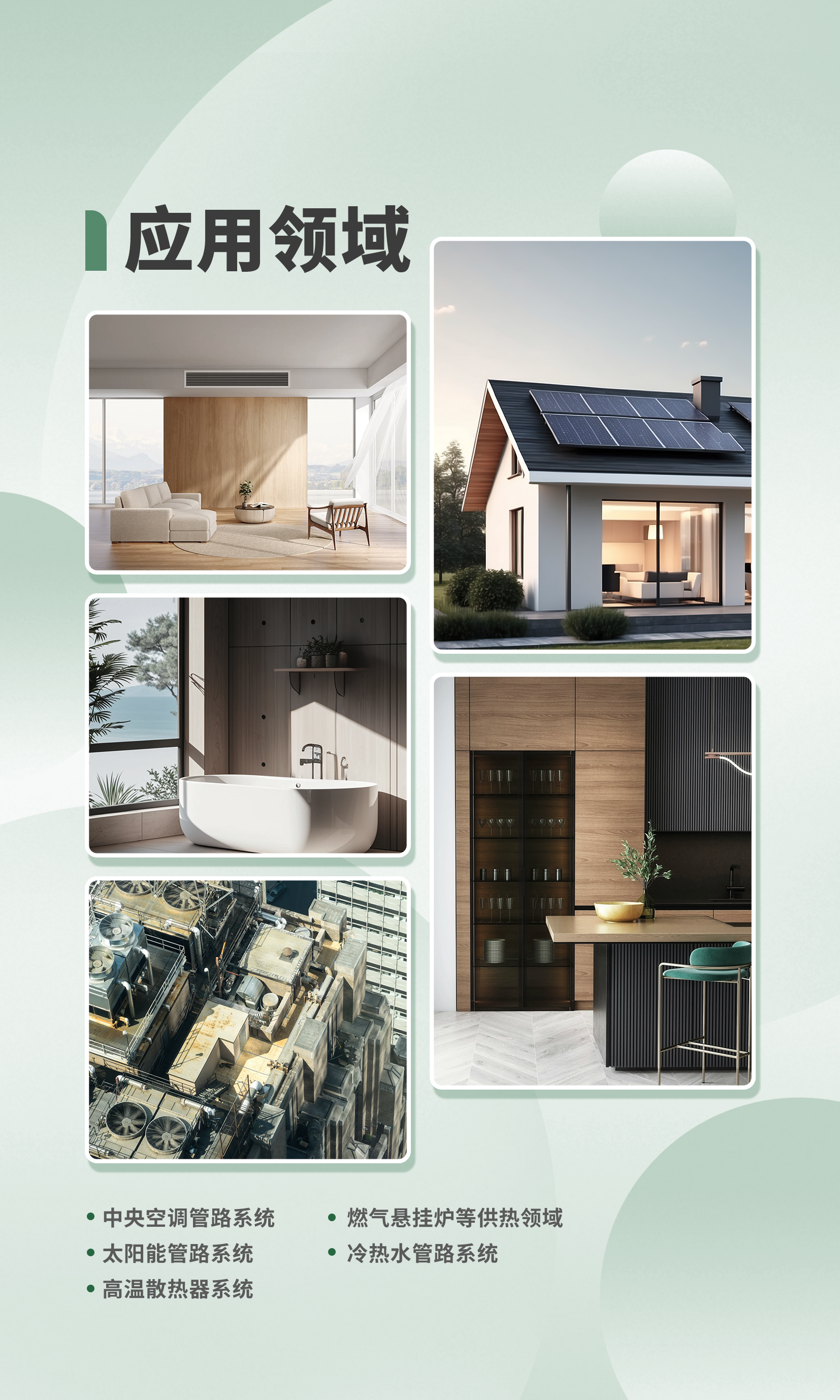 产品广泛应用于冷热水管路系统、中央空调管路系统、燃气壁挂炉等供热领域、太阳能管路系统、高温散热器系统。