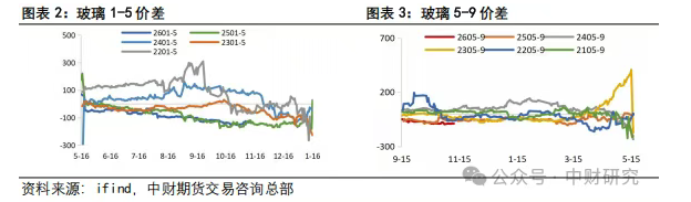 2025年,玻璃月差基本一直维持c结构。从图中可以看到,2024年绝大部分时间,玻璃5-9月差和1-5月差都为正,一是因为库存基本处于去化状态,现货相对健康,二是市场对远月地产需求预期较差,因此月间呈b结构。随着玻璃库存累积到较高水平,月差逐步转化为c结构,尤其是在下半年,由于湖北地区仓单处理难度较大的原因,近月压力很大,月差经常走向深度c结构。今年月差仍维持c的结构,但由于绝对价格较低,利润亏损等原因,月差并没有大幅走弱。