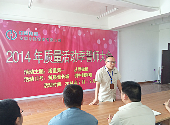 乐鱼网页版登录入口讯 2014年7月4日8点30分,公司总经理何帆、副总经理刘鲁亮以及各部门经理、各生产分管经理及生产车间成员在公司培训室隆重举行了质量季活动誓师大会,共同见证吉林乐鱼网页版登录入口管道员工向质量零缺陷发起冲刺的决心。