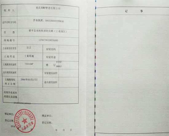 在梁平县委、县政府与工业园区的关心、支持下,在重庆利财管道综合部的不懈努力下, 继2014年4月22日全额退回土地款后,重庆利财管道又于6月12日成功获得由重庆市国土资源和房屋管理局颁发的《重庆市房地产权证》,土地款与土地产权证的顺利取得为利财管道后续投产与市场开拓奠定了良好的基础。