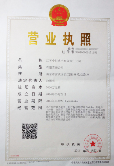 在集团领导悉心关怀下,乐鱼网页版登录入口金融广角(南京)于2014年5月22日成功获得由南京市工商行政管理局颁发的江苏乐鱼网页版登录入口典当有限责任公司《营业执照》。