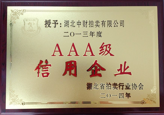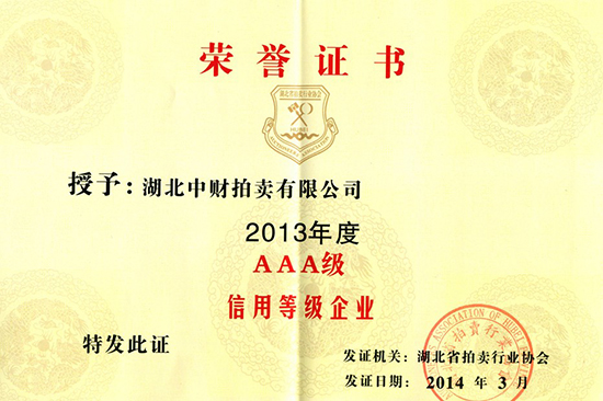 在湖北省拍卖行业协会组织的2013年度全省拍卖企业信用等级评定过程中,湖北乐鱼网页版登录入口拍卖有限公司被授予AAA级信用等级企业。