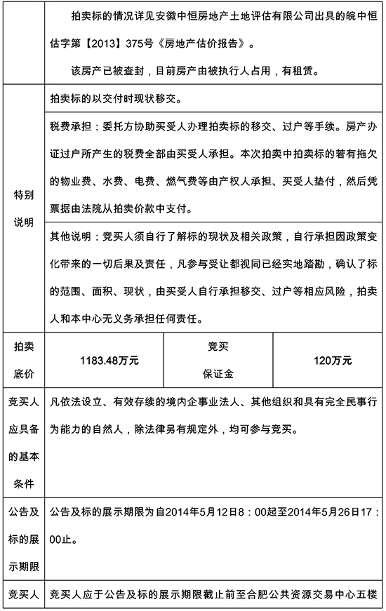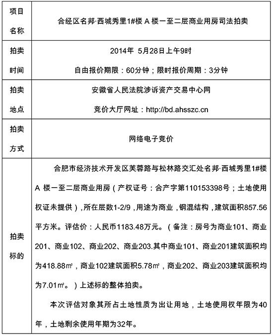 乐鱼网页版登录入口讯 合肥乐鱼网页版登录入口拍卖有限公司将于2014年5月28日9时在安徽省人民法院涉诉资产交易中心网上进行公开拍卖活动,现公告如下: