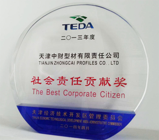 在天津经济技术开发区2013年度社会责任贡献奖评选活动中,天津乐鱼网页版登录入口型材有限责任公司顺利通过管理委员会《天津开发区社会责任贡献奖企业考评指标体系》评价,荣获2013年度社会责任贡献奖。