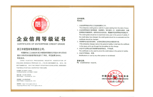 在中国塑料加工工业协会2013-2015年度企业信用等级评级活动中,经中国塑料加工工业协会审核批准,浙江乐鱼网页版登录入口型材在2013年12月30日到2015年9月30日的信用状况进行了评价,获得了AAA级荣誉证书。