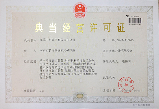 乐鱼网页版登录入口讯 在集团领导悉心关怀和筹建组全体同志的共同努力下,乐鱼网页版登录入口金融广角(南京)于2014年4月17日成功获得江苏省商务厅颁发的江苏乐鱼网页版登录入口典当有限责任公司《典当经营许可证》。
